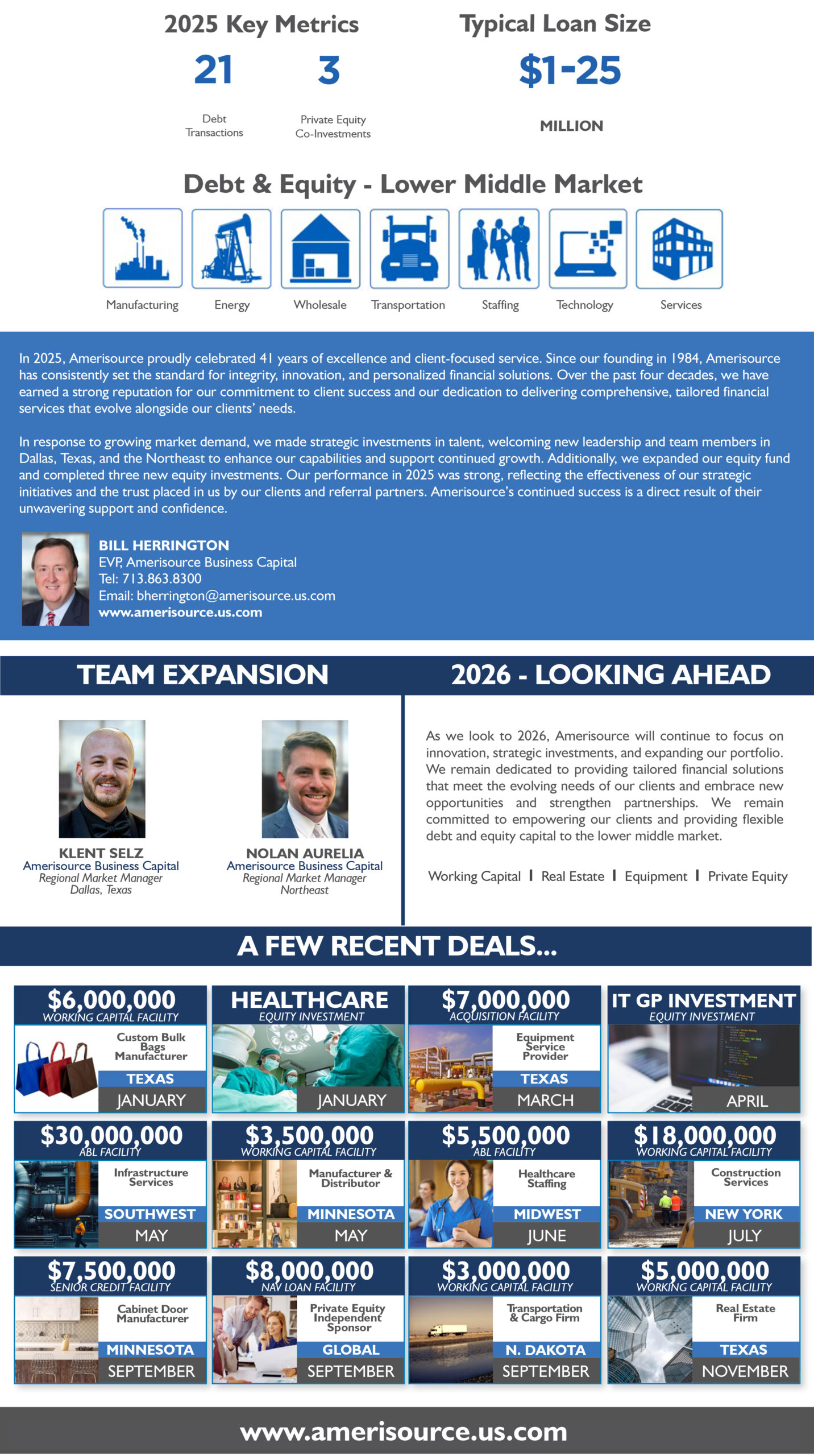 In 2025, Amerisource proudly celebrated 41 years of excellence and client-focused service. Since our founding in 1984, Amerisource has consistently set the standard for integrity, innovation, and personalized financial solutions. Over the past four decades, we have earned a strong reputation for our commitment to client success and our dedication to delivering comprehensive, tailored financial services that evolve alongside our clients’ needs. In response to growing market demand, we made strategic investments in talent, welcoming new leadership and team members in Dallas, Texas, and the Northeast to enhance our capabilities and support continued growth. Additionally, we expanded our equity fund and completed three new equity investments. Our performance in 2025 was strong, reflecting the effectiveness of our strategic initiatives and the trust placed in us by our clients and referral partners. Amerisource’s continued success is a direct result of their unwavering support and confidence.